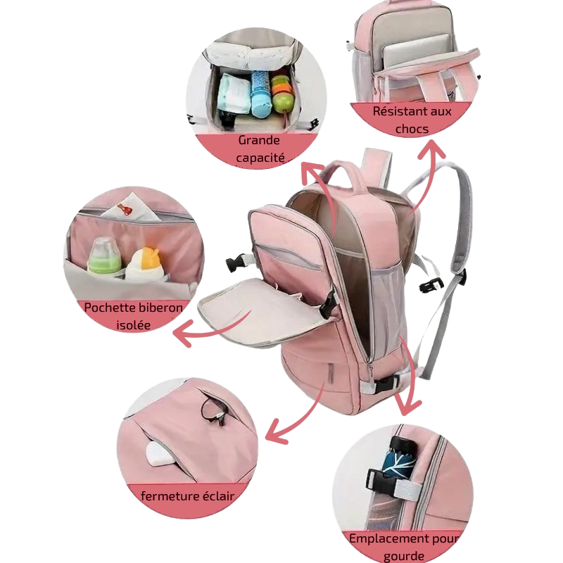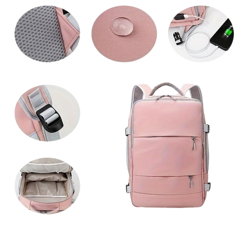 Imperméable et résistant, il protège vos affaires, tandis que son compartiment chaussures séparé et ses multiples poches assurent une organisation optimale. Son port USB intégré vous permet de rester connectée où que vous soyez (batterie externe non incluse).